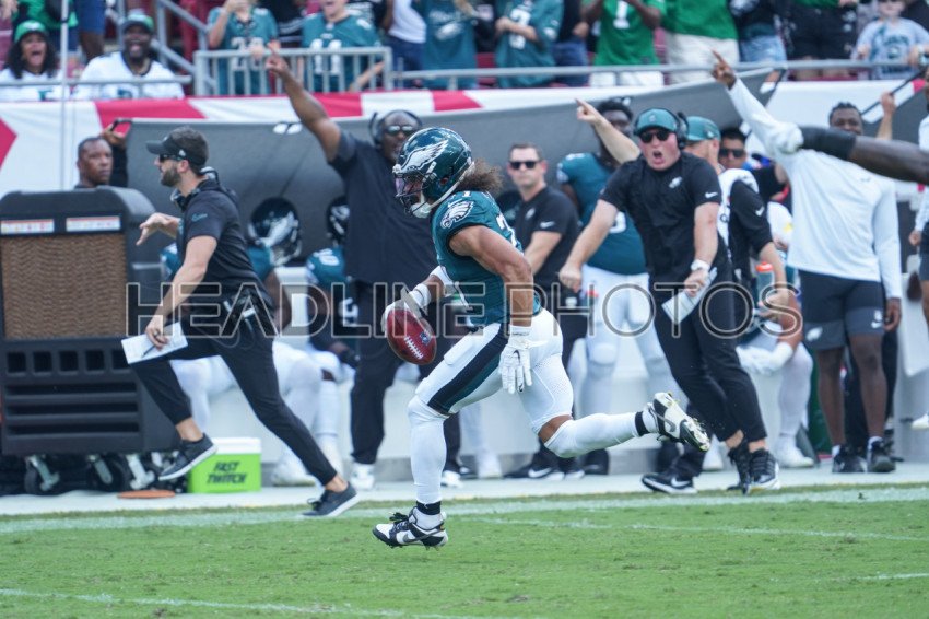 Tampa Bay, Florida, USA, September 28, 2025, Philadelphia Eagles safety Sydney Brown #21 runs to make a touchdown at Raymond James Stadium. (Photo Credit: Marty Jean-Louis)