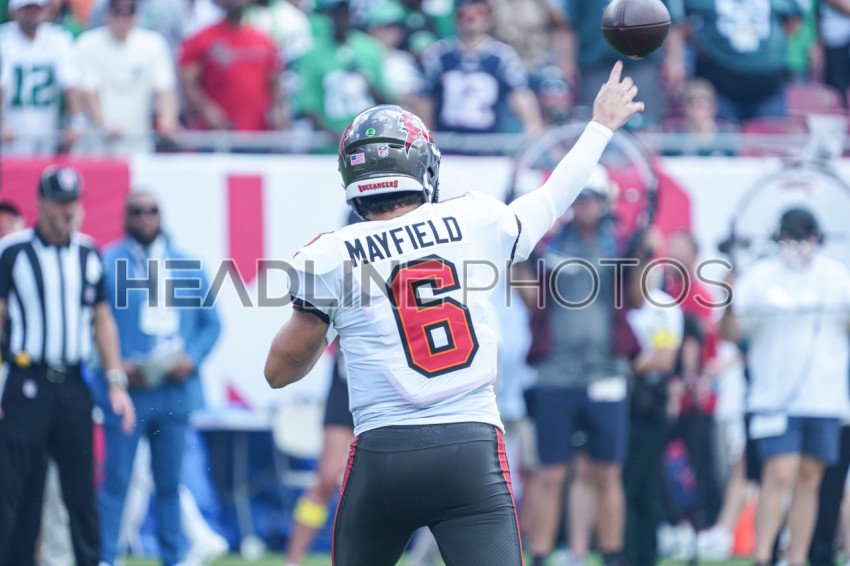 Tampa Bay, Florida, USA, September 28, 2025, Tampa Bay Buccaneers quarterback Baker Mayfield #6 makes a pass at Raymond James Stadium. (Photo Credit: Marty Jean-Louis)