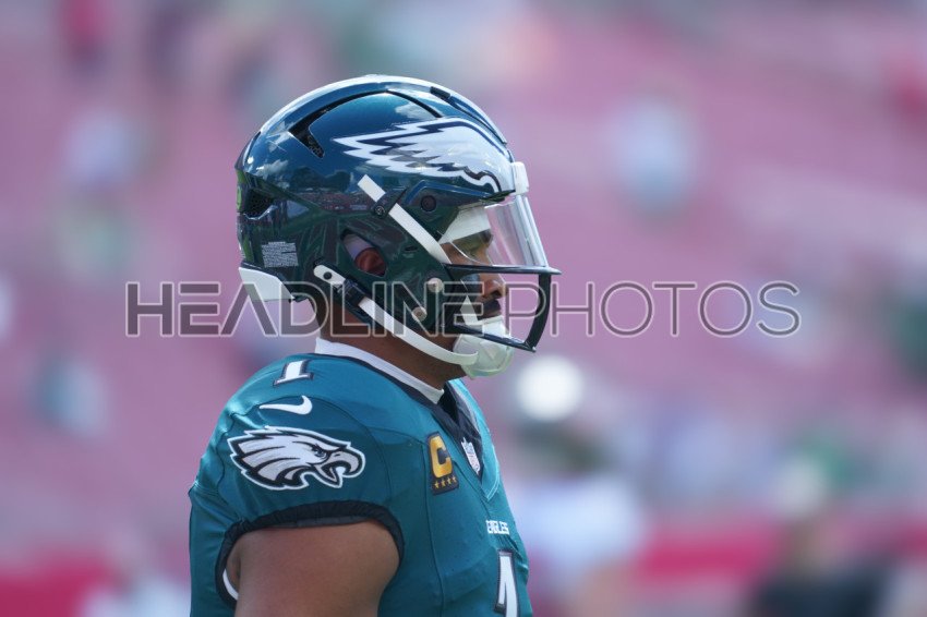 Tampa Bay, Florida, USA, September 28, 2025, Philadelphia Eagles quarterback Jalen Hurts #1 warming up at Raymond James Stadium. (Photo Credit: Marty Jean-Louis)