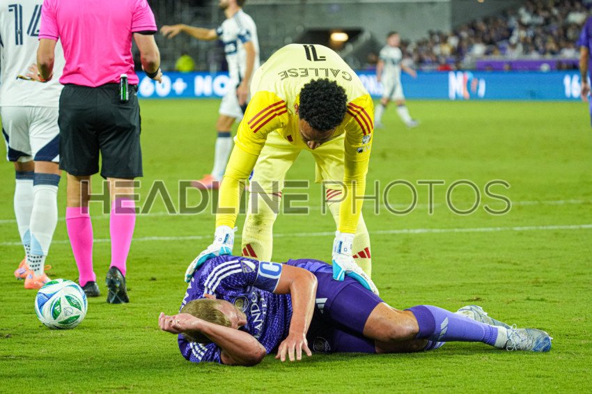 Orlando, Florida, USA, October 11, 2025, Orlando City SC defender Robin Jansson #6 is on the floor in pain as Pedro Gallese checks on him at Inter&Co Stadium. (Photo Credit: Marty Jean-Louis)