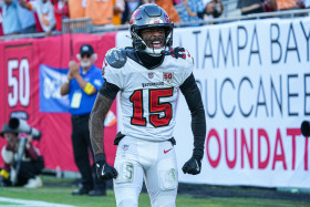 Tampa Bay, Florida, USA, October 12, 2025, Tampa Bay Buccaneers wide receiver Tez Johnson #15 celebrate after making a touchdown at Raymond James Stadium. (Photo Credit: Marty Jean-Louis)