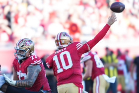 Tampa Bay, Florida, USA, October 12, 2025, San Francisco 49ers quarterback Mac Jones #10 makes a pass at Raymond James Stadium. (Photo Credit: Marty Jean-Louis)