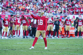 Tampa Bay, Florida, USA, October 12, 2025, San Francisco 49ers kicker Eddy Pineiro #18 makes a kick at Raymond James Stadium. (Photo Credit: Marty Jean-Louis)
