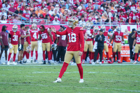 Tampa Bay, Florida, USA, October 12, 2025, San Francisco 49ers kicker Eddy Pineiro #18 makes a kick at Raymond James Stadium. (Photo Credit: Marty Jean-Louis)