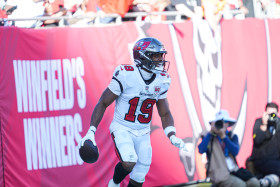 Tampa Bay, Florida, USA, October 12, 2025, Tampa Bay Buccaneers wide receiver Kameron Johnson #19 celebrate after a touchdown at Raymond James Stadium. (Photo Credit: Marty Jean-Louis)