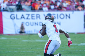 Tampa Bay, Florida, USA, October 12, 2025, Tampa Bay Buccaneers running back Rachaad White #1 makes a run at Raymond James Stadium. (Photo Credit: Marty Jean-Louis)