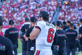 Tampa Bay, Florida, USA, October 12, 2025, Tampa Bay Buccaneers Baker Mayfield #6 at Raymond James Stadium. (Photo Credit: Marty Jean-Louis)