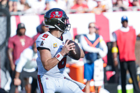 Tampa Bay, Florida, USA, October 12, 2025, Tampa Bay Buccaneers Baker Mayfield #6 makes a pass at Raymond James Stadium. (Photo Credit: Marty Jean-Louis)