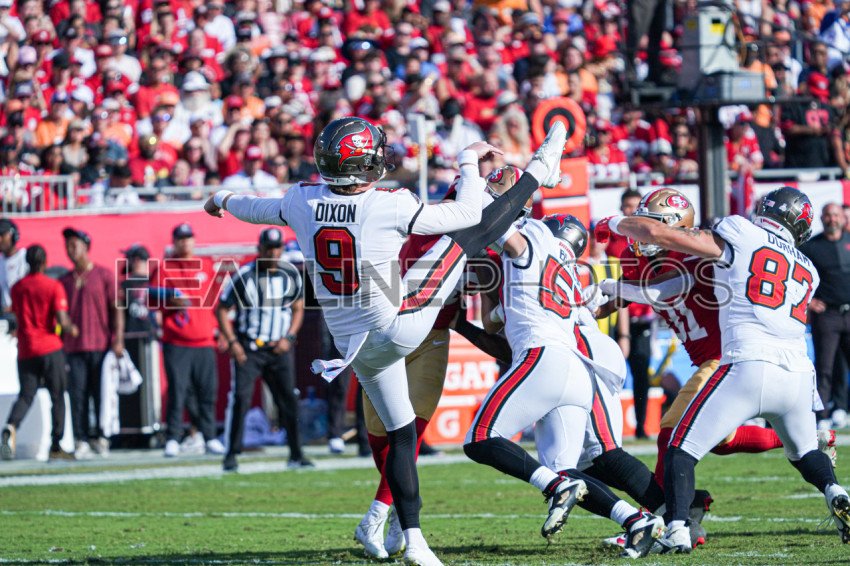Tampa Bay, Florida, USA, October 12, 2025, San Francisco 49ers punter Riley Dixon #9 makes a punt at Raymond James Stadium. (Photo Credit: Marty Jean-Louis)