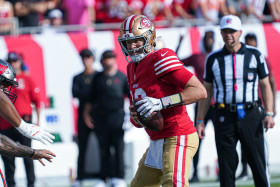 Tampa Bay, Florida, USA, October 12, 2025, San Francisco 49ers quarterback Mac Jones #10 looks to make a pass at Raymond James Stadium. (Photo Credit: Marty Jean-Louis)