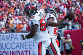 Tampa Bay, Florida, USA, October 12, 2025, Tampa Bay Buccaneers corner back Kindle Vildor #22 and and CJ Brewer #52 celebrate after making a touchdown at Raymond James Stadium. (Photo Credit: Marty Jean-Louis)