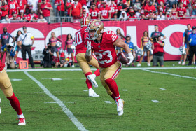 Tampa Bay, Florida, USA, October 12, 2025, San Francisco 49ers runningback Christian McCaffrey #23 makes a run at Raymond James Stadium. (Photo Credit: Marty Jean-Louis)