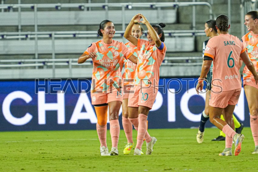 Orlando, Florida, USA, October 15, 2025, Orlando Pride players celebrate after Marta #10 scores during the Concacaf W Champions Cup at Inter&Co Stadium. (Photo Credit: Marty Jean-Louis)