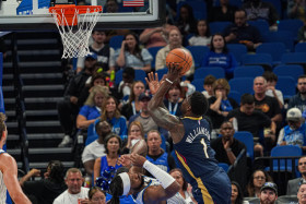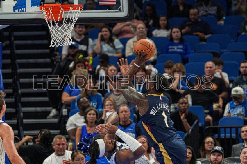 Orlando, Florida, USA, October 16, 2025, New Orleans Pelicans forward Zion Williamson #1 attempt to score but fouls Wendell Carter Jr #34 during the first half at the Kia Center. (Photo Credit: Marty Jean-Louis)