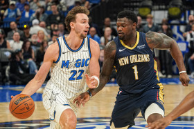Orlando, Florida, USA, October 16, 2025, Orlando Magic forward Franz Wagner #22 attempt to run pass Zion Williamson #1 at the Kia Center. (Photo Credit: Marty Jean-Louis)