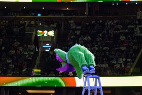 Orlando, Florida, USA, October 22, 2025, Orlando Magic moscot Stuff does a stunt at the Kia Center. (Photo Credit: Marty Jean-Louis)