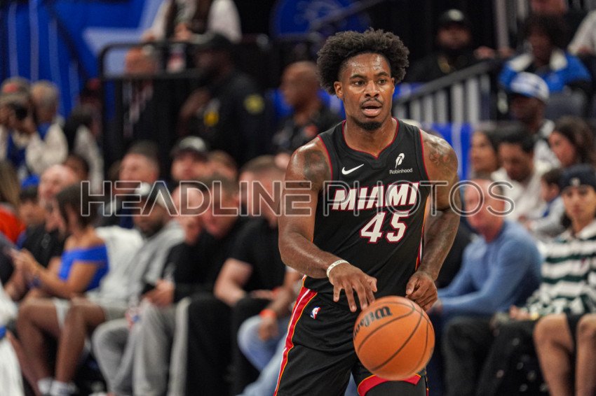 Orlando, Florida, USA, October 22, 2025, Miami Heat guard Davion Mitchell #45 rushes forward at the Kia Center. (Photo Credit: Marty Jean-Louis)