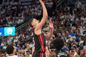 Orlando, Florida, USA, October 22, 2025, Miami Heat forward Nikola Jovic #5 attempt to score at the Kia Center. (Photo Credit: Marty Jean-Louis)