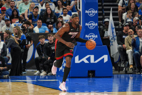 Orlando, Florida, USA, October 22, 2025, Miami Heat center Bam Adebayo #13 rushes forward at the Kia Center. (Photo Credit: Marty Jean-Louis)