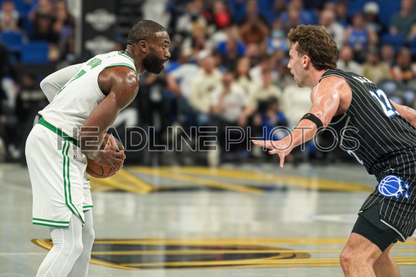 Orlando, Florida, USA, November 7, 2025, Boston Celtics forward Jaylen Brown #7 face Franz Wagner #22 at the Kia Center. (Photo Credit: Marty Jean-Louis)