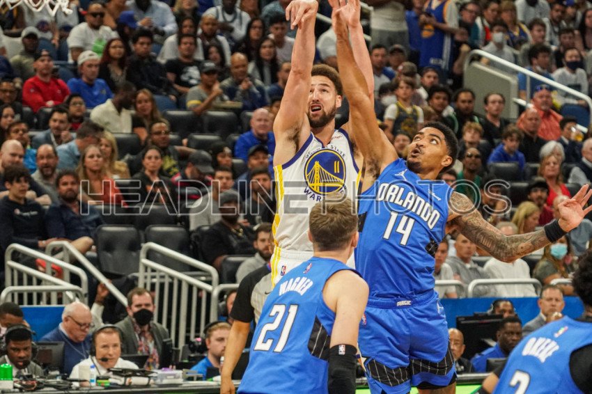 Orlando, Florida, USA, March 22, 2022, Golden State Warriors Shooting guard Klay Thompson #11 shoots a three point shot at the Amway Center. (Photo Credit: Marty Jean-Louis)
