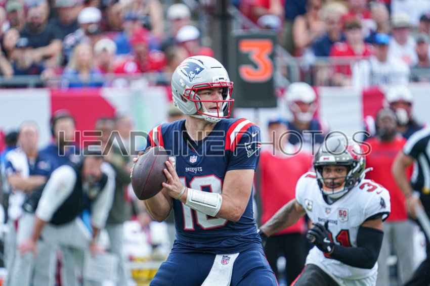 Tampa Bay, Florida, USA, November 9, 2025, New England Patriots quarterback Drake Maye #10 readies to make a pass at Raymond James Stadium. (Photo Credit: Marty Jean-Louis)