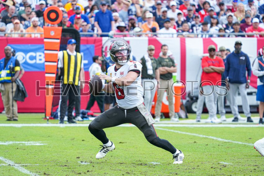 Tampa Bay, Florida, USA, November 9, 2025, Tampa Bay Buccaneers quarterback Baker Mayfield #6 readies to make a pass at Raymond James Stadium. (Photo Credit: Marty Jean-Louis)