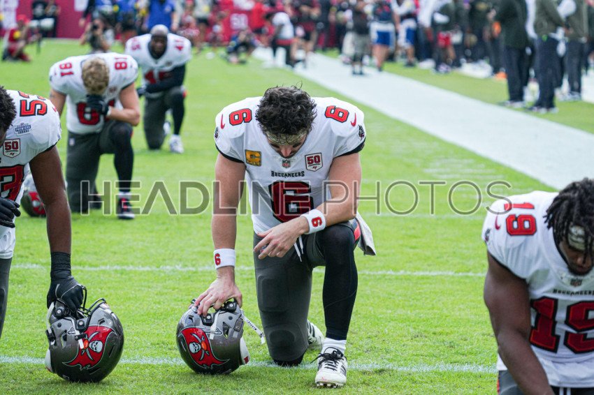 Tampa Bay, Florida, USA, November 9, 2025, Tampa Bay Buccaneers quarterback Baker Mayfield #6 kneel to pray at Raymond James Stadium. (Photo Credit: Marty Jean-Louis)