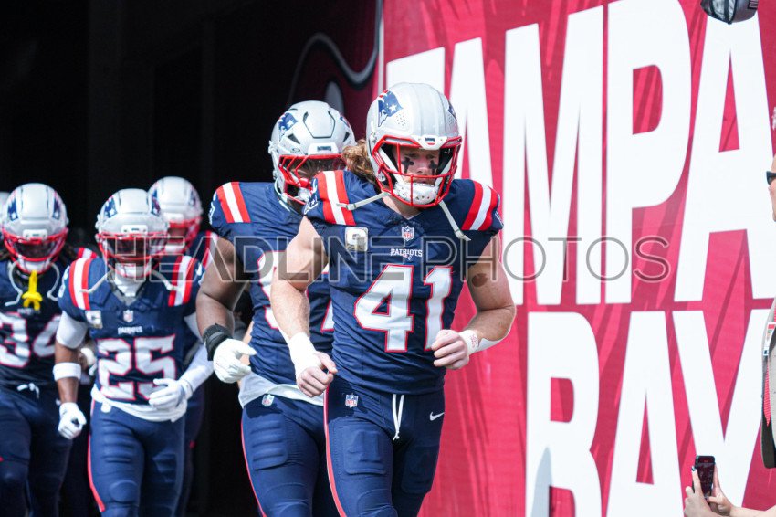 Tampa Bay, Florida, USA, November 9, 2025, New England Patriots player Brenden Schooler #41 runs out of the tunnel at Raymond James Stadium. (Photo Credit: Marty Jean-Louis)