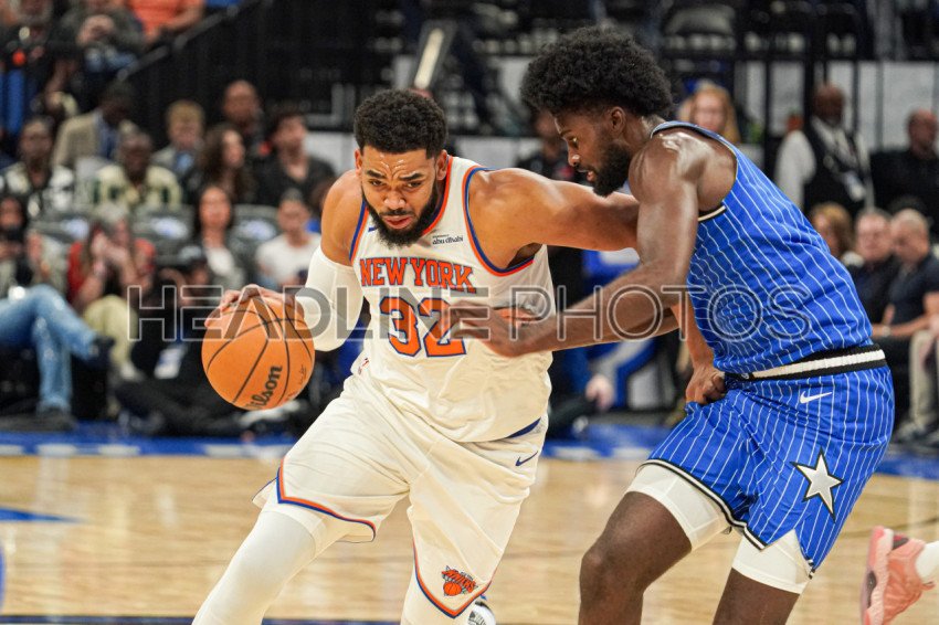 Orlando, Florida, USA, November 22, 2025, New York Knicks forward Karl-Anthony Towns #32 attempt to run pass Jonathan Isaac #1 at the Kia Center. (Photo Credit: Marty Jean-Louis)