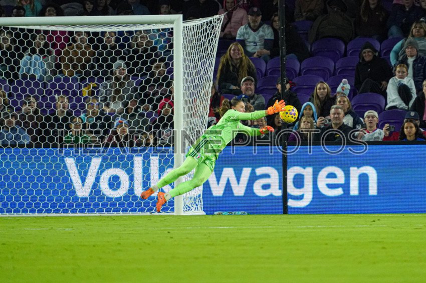 Orlando, USA, November 28, 2025, Italy's Women National Team goalkeeper Laura Giuliana #1 jumps to make a save at Inter&Co Stadium. (Photo Credit: Marty Jean-Louis)