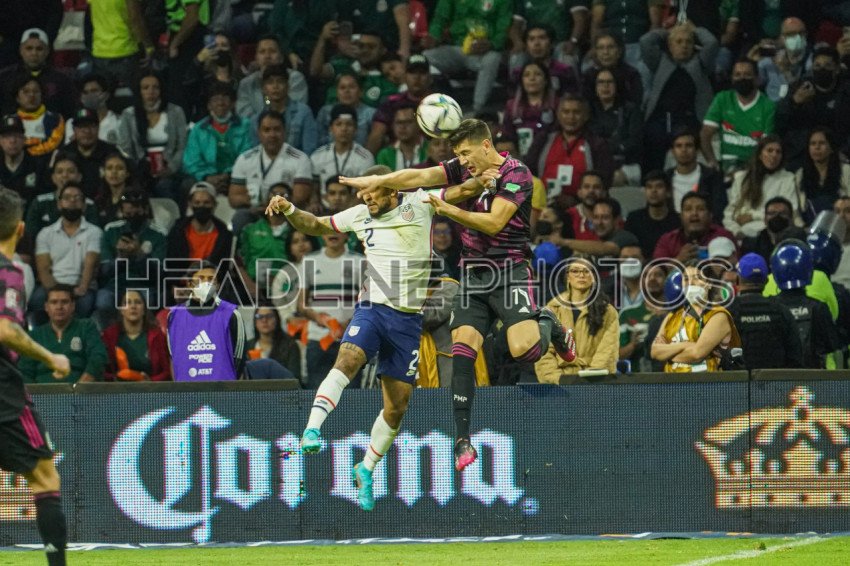 Mexico City, Mexico, March 24, 2022, Mexico Defender Cesar Jasib Montes Castro #19 wins the header in the 2022 World Cup Qualifier at Allianz Field. (Photo Credit: Marty Jean-Louis)
