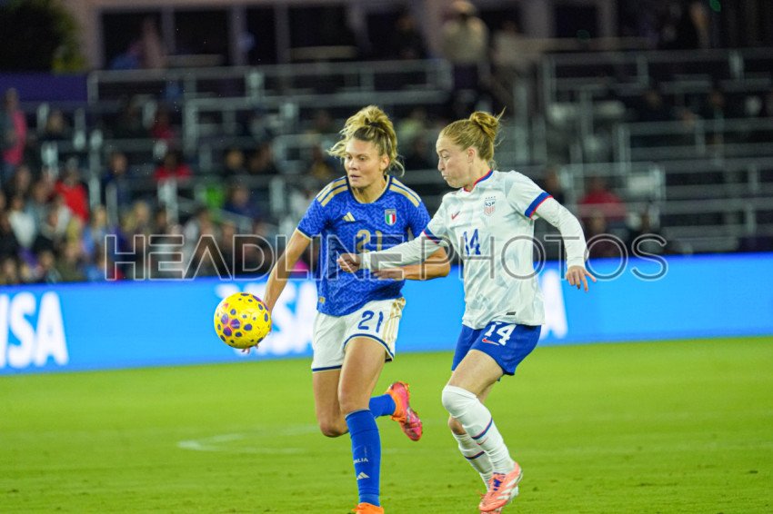 Orlando, USA, November 28, 2025, Italy's Women National Team player Michela Cambiaghi #21 and the U.S. National Women's Team player Emily Sonnett #14 fight the for ball at Inter&Co Stadium. (Photo Credit: Marty Jean-Louis)