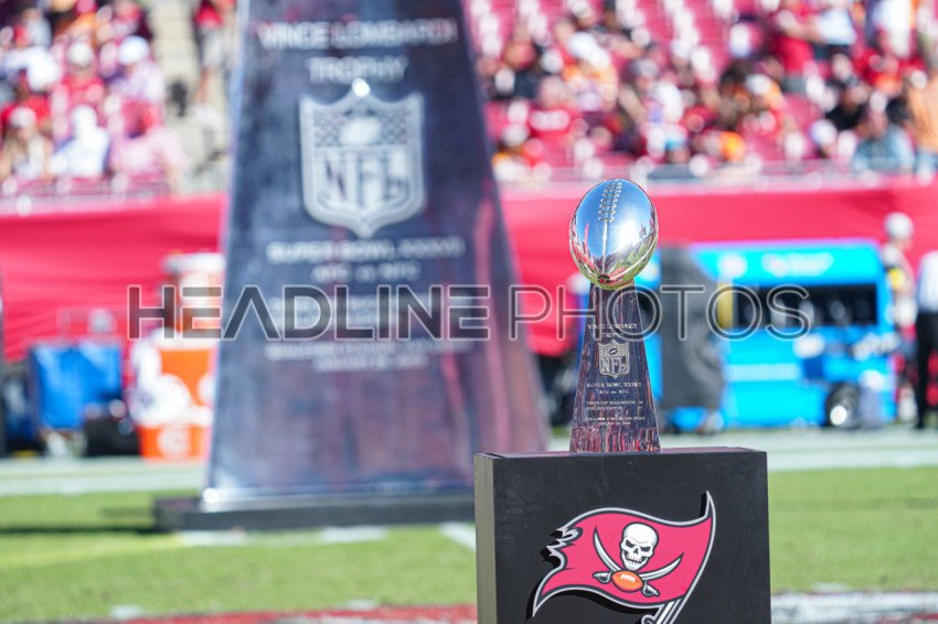 Tampa Bay, Florida, USA, November 30, 2025, Vince Lombardi Trophy at Raymond James Stadium. (Photo Credit: Marty Jean-Louis)