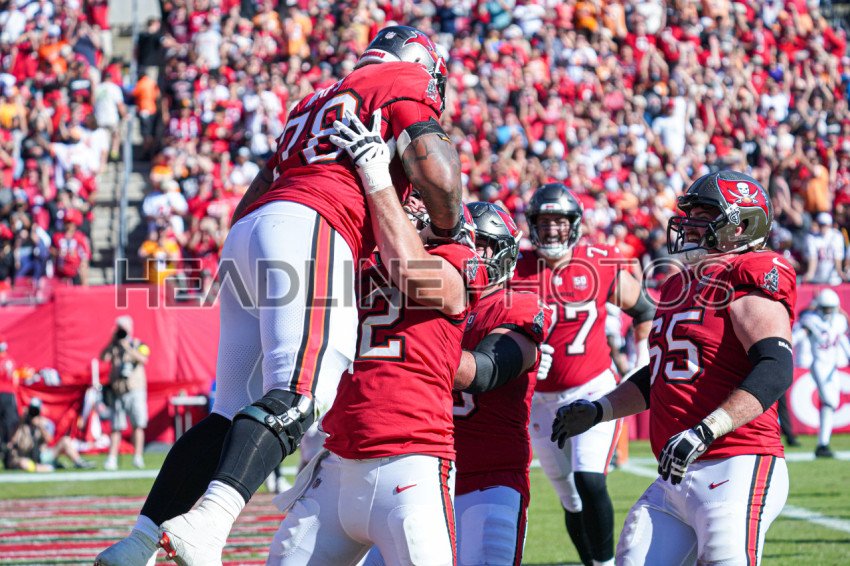 Tampa Bay, Florida, USA, November 30, 2025, Tampa Bay Buccaneers player Tristan Wirfs #78 is lifted high after making a touchdown at Raymond James Stadium. (Photo Credit: Marty Jean-Louis)