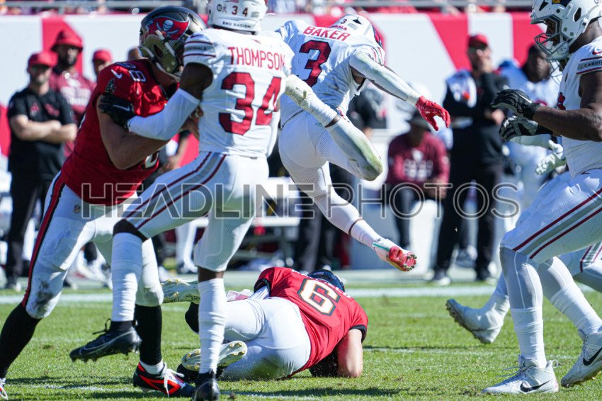 Tampa Bay, Florida, USA, November 30, 2025, Arizona Cardinals safety Budda Baker #3 leaps over Baker Mayfield #6 at Raymond James Stadium. (Photo Credit: Marty Jean-Louis)