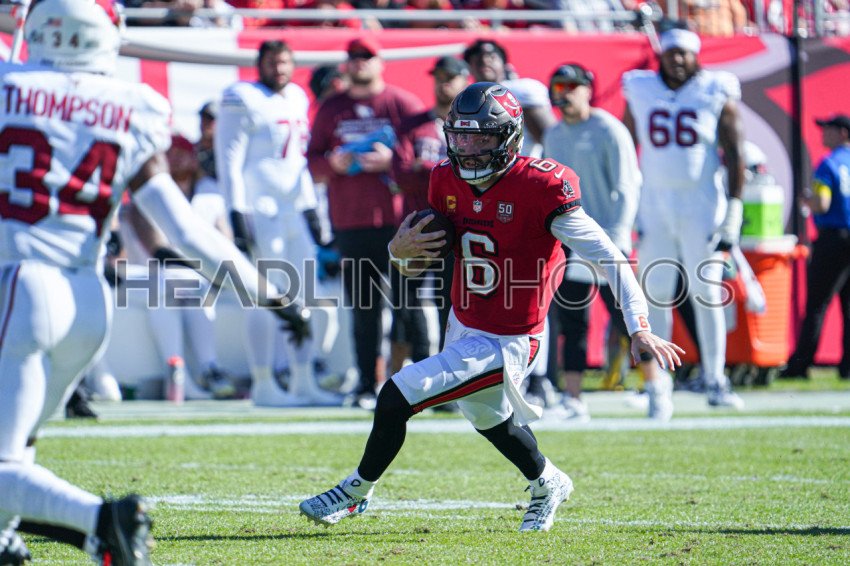 Tampa Bay, Florida, USA, November 30, 2025,Tampa Bay Buccaneers quarterback Baker Mayfield #6 on the run at Raymond James Stadium. (Photo Credit: Marty Jean-Louis)
