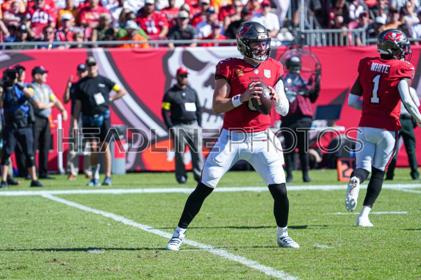Tampa Bay, Florida, USA, November 30, 2025,Tampa Bay Buccaneers quarterback Baker Mayfield #6 look to make a pass at Raymond James Stadium. (Photo Credit: Marty Jean-Louis)