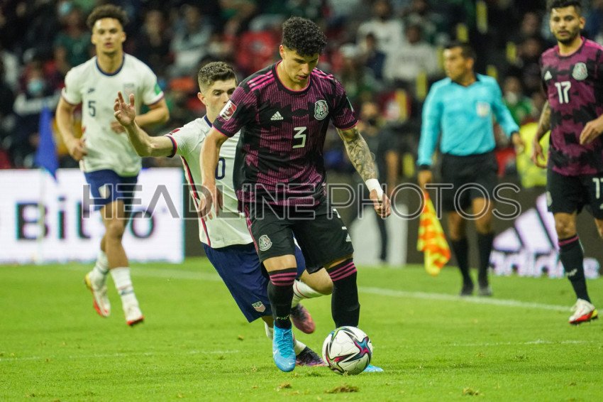 Mexico City, Mexico, March 24, 2022, Mexico defender Cesar Jasib Montes Castro #19 fight to keep the ball as Christian Pulisic runs behind in the 2022 World Cup Qualifier at Allianz Field. (Photo Credit: Marty Jean-Louis)