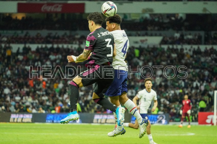 Mexico City, Mexico, March 24, 2022, USA Captain Tyler Adams wins the header in the 2022 World Cup Qualifier at Allianz Field. (Photo Credit: Marty Jean-Louis)