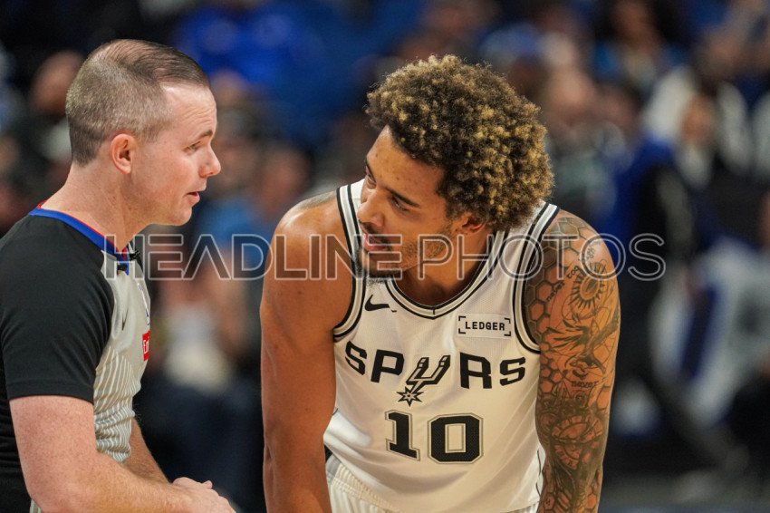 Orlando, Florida, USA, December 3, 2025, San Antonio Spurs player Jeremy Sochan #10 speaking with one of the Officials at the Kia Center. (Photo Credit: Marty Jean-Louis)