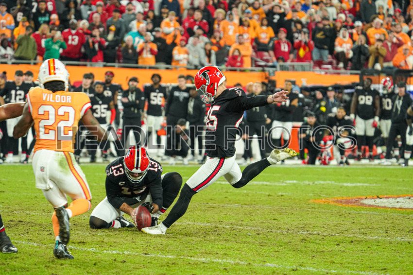 Tampa Bay, Florida, USA, December 11, 2025, Atlanta Falcons kicker Zane Gonzalez #45 makes a kick to win the game at Raymond James Stadium. (Photo Credit: Marty Jean-Louis)