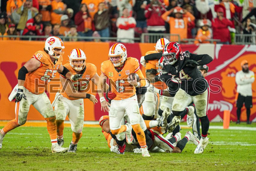 Tampa Bay, Florida, USA, December 11, 2025, Tampa Bay Buccaneers quarterback Baker Mayfield #6 on the run at Raymond James Stadium. (Photo Credit: Marty Jean-Louis)