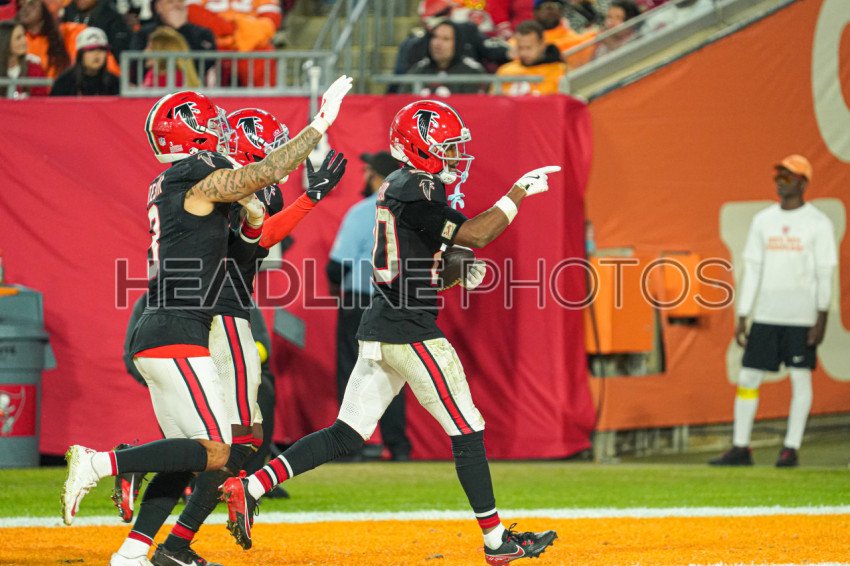 Tampa Bay, Florida, USA, December 11, 2025, Atlanta Falcons players celebrate a play at Raymond James Stadium. (Photo Credit: Marty Jean-Louis)