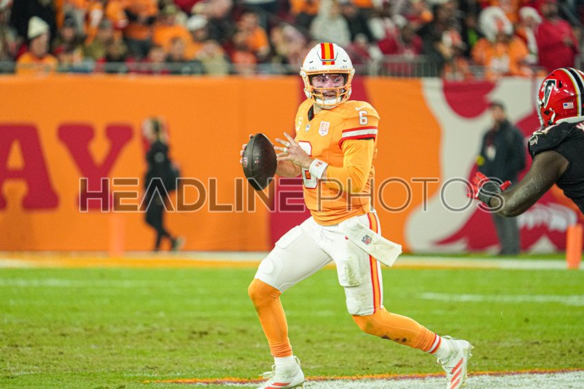 Tampa Bay, Florida, USA, December 11, 2025, Tampa Bay Buccaneers quarterback Baker Mayfield #6 makes a pass at Raymond James Stadium. (Photo Credit: Marty Jean-Louis)
