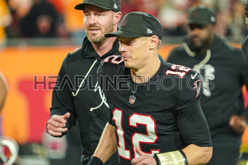 Tampa Bay, Florida, USA, December 11, 2025, Atlanta Falcons quarterback Easton Stick #12 at Raymond James Stadium. (Photo Credit: Marty Jean-Louis)