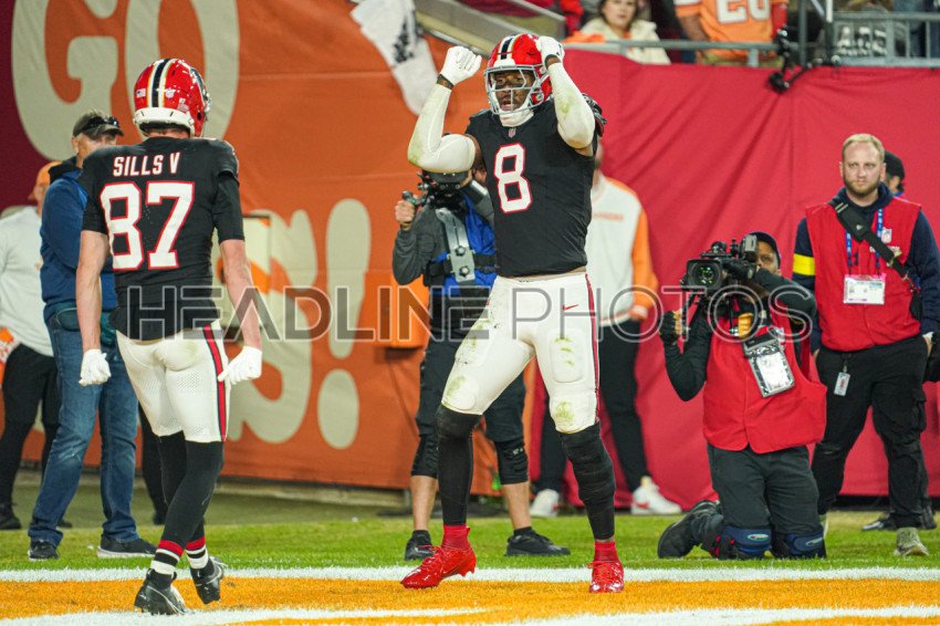 Tampa Bay, Florida, USA, December 11, 2025, Atlanta Falcons player Kyle Pitts Sr #8 celebrate a touchdown at Raymond James Stadium. (Photo Credit: Marty Jean-Louis)