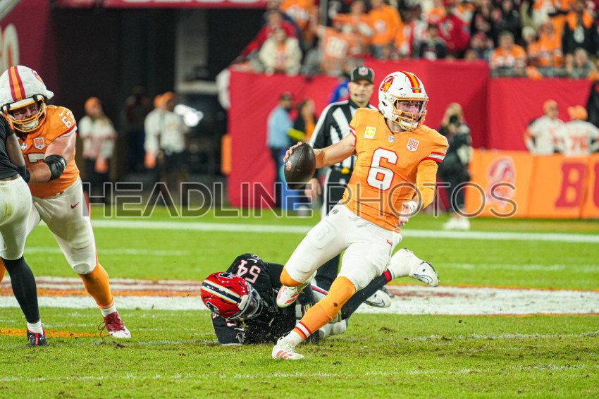Tampa Bay, Florida, USA, December 11, 2025, Tampa Bay Buccaneers's Baker Mayfield #6 on the run at Raymond James Stadium. (Photo Credit: Marty Jean-Louis)