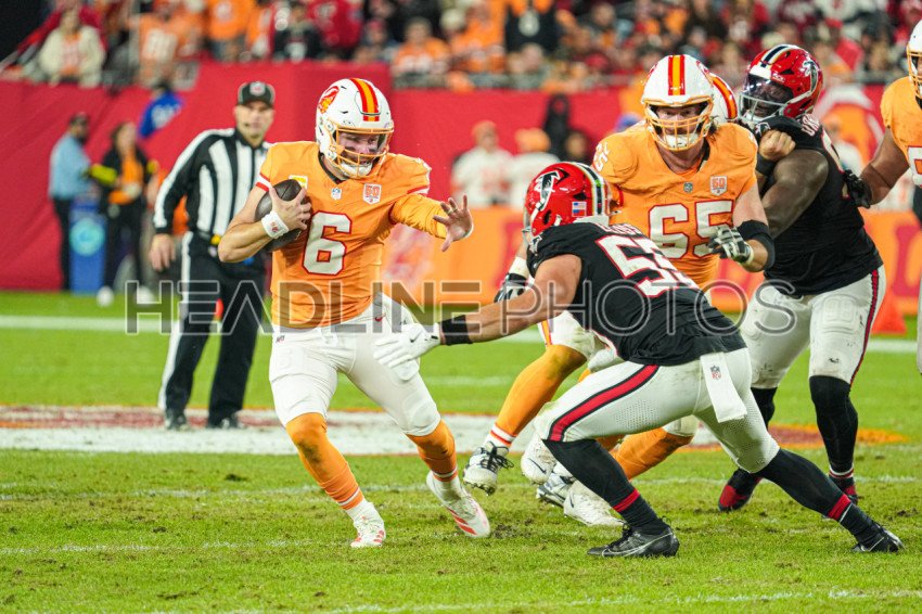 Tampa Bay, Florida, USA, December 11, 2025, Tampa Bay Buccaneers's Baker Mayfield #6 on the run at Raymond James Stadium. (Photo Credit: Marty Jean-Louis)