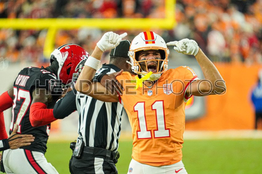 Tampa Bay, Florida, USA, December 11, 2025, Tampa Bay Buccaneers player Jalen McMillan #11 celebrate a play at Raymond James Stadium. (Photo Credit: Marty Jean-Louis)
